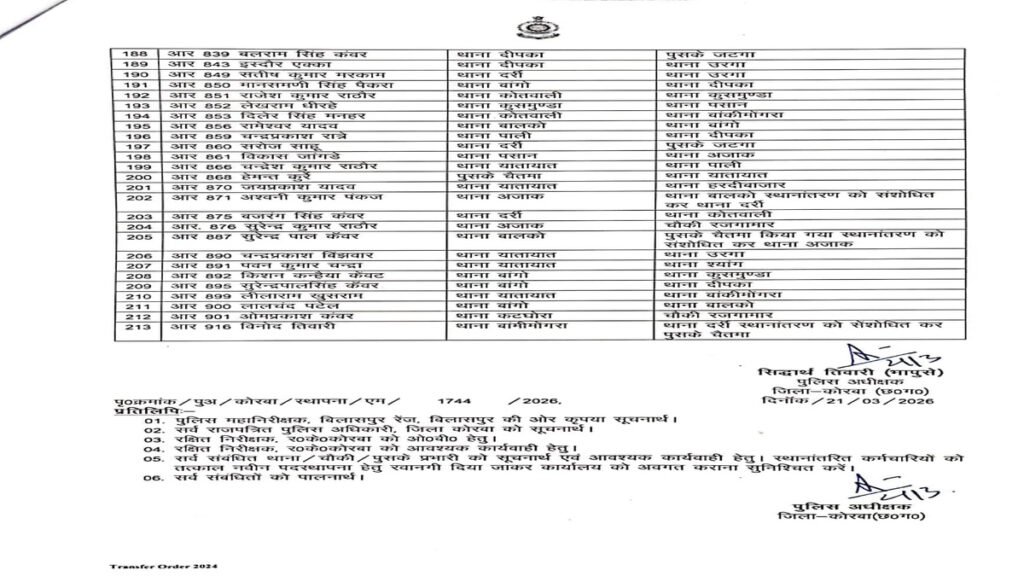 कोरबा: जिला पुलिस अधीक्षक (SP) ने जिले की पुलिसिंग व्यवस्था में कसावट लाने के उद्देश्य से शनिवार को एक बड़ी तबादला सूची जारी की है। इस आदेश के तहत कुल 187 पुलिसकर्मियों को इधर से उधर किया गया है।