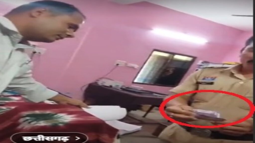 रिश्वतखोरी: वर्दीधारी कॉन्स्टेबल लक्ष्मी शंकर कंवर पीड़ित पक्ष से 100-100 रुपये के नोट ले रहा है और उन्हें गिनकर अपनी जेब में रखते हुए दिखाई दे रहा है।