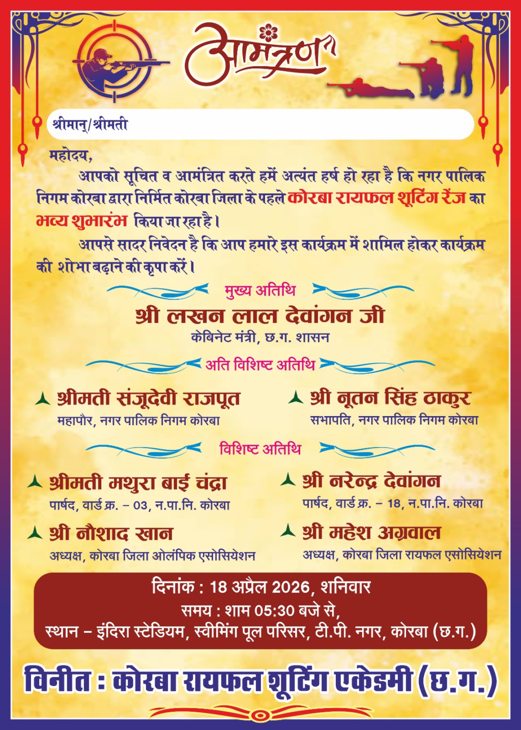 कोरबा रायफल शूटिंग एकेडमी का शुभारंभ अवसर पर केबिनेट मंत्री लखन लाल देवागन, महापौर संजू देवी के साथ विशिष्ट अतिथि के रूप में सभापति नूतनसिंह, पार्षद नरेंद्र देवांगन, पार्षद श्रीमती मथुरा बाई चंदा, जिला ओलंपिक संघ के अध्यक्ष नौशाद खान, जिला रायफल संघ के अध्यक्ष महेश अग्रवाल सहित खेल संघ के पदाधिकारी और खिलाड़ी उपस्थित रहेंगे।