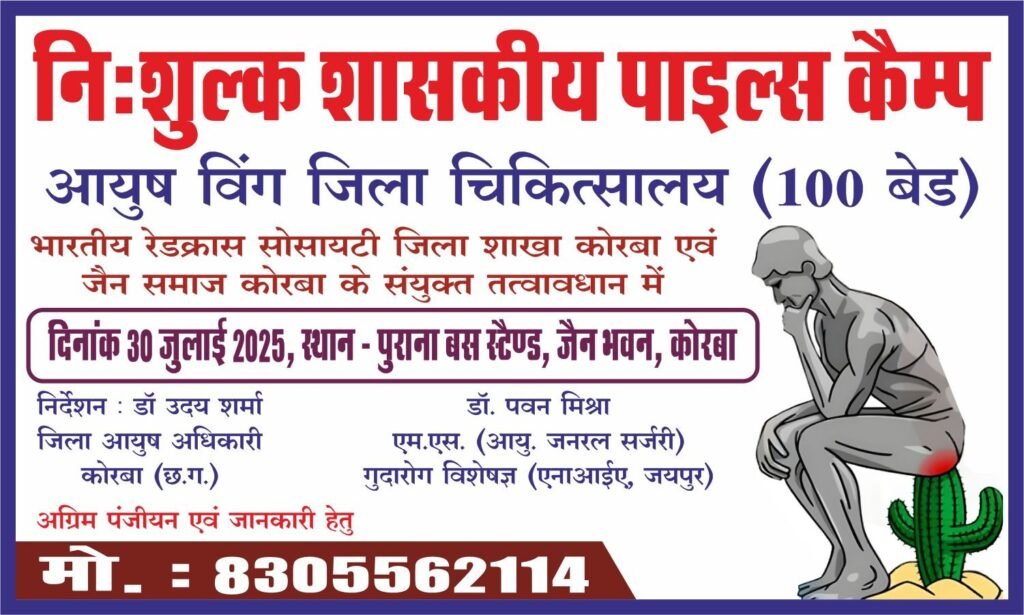 भारतीय रेडक्रास सोसायटी जिला शाखा कोरबा एवं जैन समाज कोरबा के संयुक्त तत्वावधान में दिनांक 30 जुलाई 2025 को पुराना बस स्टैंड, जैन भवन, कोरबा में एक निःशुल्क शासकीय पाइल्स कैम्प का आयोजन किया जा रहा है।
