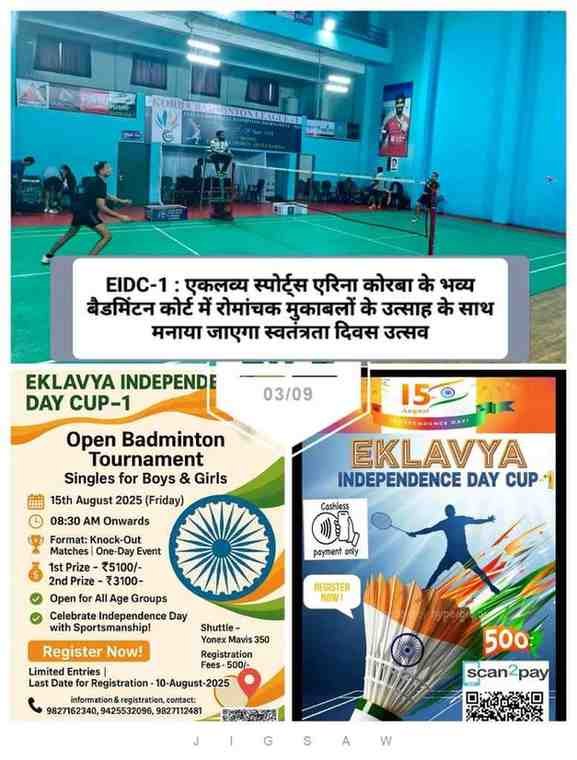 कोरबा। एकलव्य स्पोर्ट्स एरिना कोरबा के तत्वावधान में स्वतंत्रता दिवस की 79वीं वर्षगांठ पर स्पेशल टूर्नामेंट आयोजित किया जा रहा है। शुक्रवार 15 अगस्त 2025 को आयोजित होने वाले इस ओपन बैडमिंटन टूर्नामेंट की पहली कड़ी का शीर्षक “एकलव्य इंडिपेंडेंस डे कप – 1 (EIDC -1) रखा गया है। एकलव्य स्पोर्ट्स एरिना कोरबा के अध्यक्ष डॉ संजय अग्रवाल ने बताया कि इस प्रतियोगिता में एकल इवेंट के रूप में बालक बालिका अथवा महिला एवं पुरुष वर्ग के खिलाड़ी भाग ले सकेंगे।
