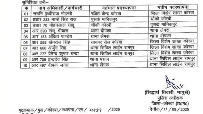 जारी आदेश के मुताबिक, एएसआई पृथ्वीराज मोहंती सहित संबंधित पुलिसकर्मियों को तत्काल प्रभाव से नई पदस्थापना स्थल पर जॉइन करने के निर्देश दिए गए हैं। पुलिस अधीक्षक ने बताया कि यह बदलाव कार्य में सुगमता और कानून-व्यवस्था को और बेहतर बनाए रखने के लिए किया गया है।