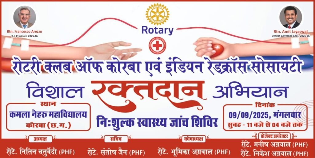 कोरबा। रोटरी क्लब ऑफ कोरबा एवं इंडियन रेडक्रॉस सोसायटी के संयुक्त तत्वावधान में आगामी मंगलवार, 9 सितम्बर 2025 को कमला नेहरू महाविद्यालय, कोरबा में विशाल रक्तदान अभियान एवं निःशुल्क स्वास्थ्य जांच शिविर का आयोजन किया जाएगा। यह कार्यक्रम सुबह 11 बजे से दोपहर 4 बजे तक चलेगा।