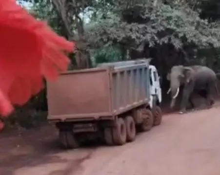 हाथी का आतंक, ट्रक ड्राइवर ने रिवर्स कर बचाई जान