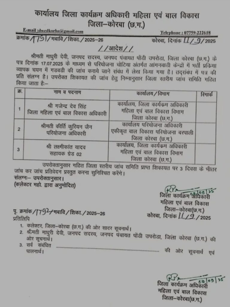 कोरबा। जिले के आकांक्षी ब्लॉक पोंड़ी उपरोड़ा अंतर्गत महिला एवं बाल विकास विभाग के चोटिया परियोजना में आंगनबाड़ी कार्यकर्ता/सहायिका भर्ती प्रक्रिया में अनियमितताओं के आरोप लगने के बाद जिला प्रशासन ने सख्त कदम उठाया है। कलेक्टर के निर्देश पर जिला कार्यक्रम अधिकारी (डीपीओ) श्रीमती रेणु प्रकाश ने तीन सदस्यीय जिला स्तरीय जांच समिति गठित की है।