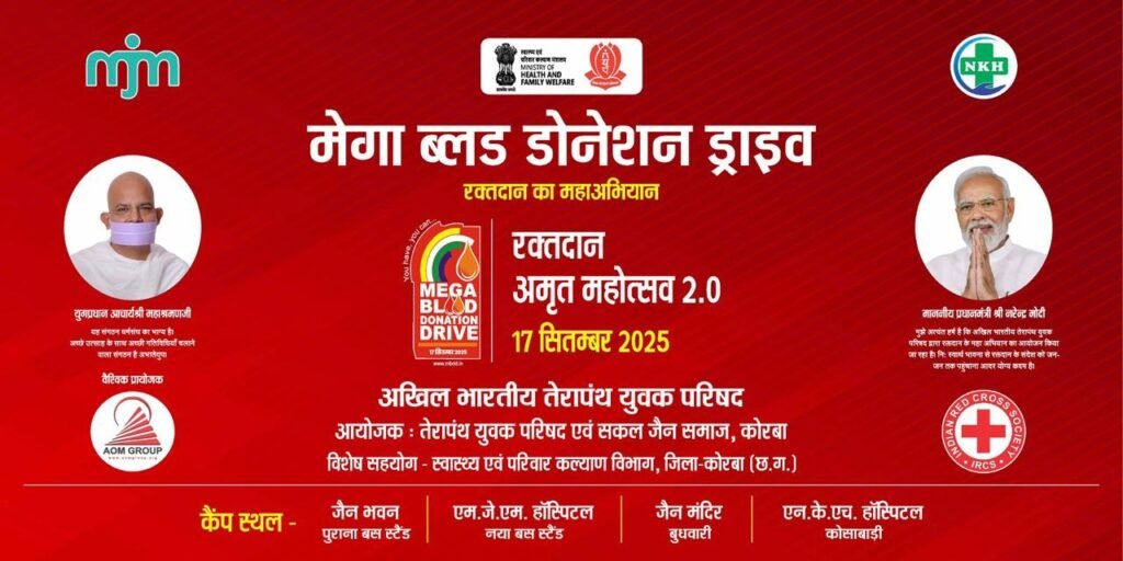 कोरबा। प्रधानमंत्री श्री नरेंद्र मोदी के आह्वान एवं स्वास्थ्य एवं परिवार कल्याण मंत्रालय, भारत सरकार के मार्गदर्शन में 17 सितम्बर 2025 को पूरे देश में मेगा ब्लड डोनेशन ड्राइव – रक्तदान अमृत महोत्सव 2.0 आयोजित किया जा रहा है। इस राष्ट्रीय महाअभियान के तहत छत्तीसगढ़ के कोरबा जिले में भी तेरापंथ युवक परिषद, सकल जैन समाज एवं अन्य सामाजिक संस्थाओं द्वारा इंडियन रेड क्रॉस सोसाइटी और राज्य स्वास्थ्य विभाग के सहयोग से कई रक्तदान शिविर आयोजित होंगे।