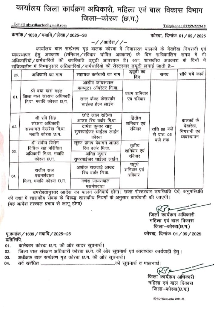 महिला एवं बाल विकास विभाग, कोरबा की DPO द्वारा जारी आदेश के मुताबिक जिला बाल संरक्षण इकाई के प्रमुख दयादास महंत के अलावा रवि सिंह, संदीप बिसेन और राजीव राज के अधीन अन्य 8 कर्मचारियों की ड्यूटी बाल संप्रेक्षण गृह में लगाई गई है, जो शनिवार और रविवार को होने वाली छुट्टी के दिन संप्रेक्षण गृह में रात के वक्त रहेंगे और बालकों की देखरेख, निगरानी और व्यवस्थापन करेंगे। विशेष तौर पर उल्लेख है कि अवकाश के दिनों में रात्रिकालीन ड्यूटी देनी है, अर्थात रात्रि जागरण करें और बच्चों की निगरानी करें।