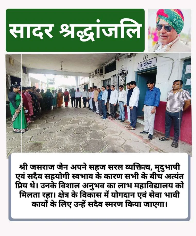 कोरबा। जिले के वरिष्ठ पत्रकार, प्रतिष्ठित नागरिक, समाज सेवी एवं कमला नेहरू महाविद्यालय समिति के पूर्व अध्यक्ष जसराज जैन ने निधन पर शोक व्यक्त करते हुए श्रद्धांजलि अर्पित की गई। सरल, मृदुभाषी एवं सदैव सहयोगी स्वभाव के कारण सभी के बीच अत्यंत प्रिय थे। बुधवार दोपहर तीन बजे महाविद्यालय परिसर में दो मिनट का मौन धारण कर ईश्वर से दिवंगत आत्मा की शांति की प्रार्थना की गई। प्राचार्य डॉ प्रशांत बोपापुरकर ने कहा कि उनके विशाल अनुभव का लाभ महाविद्यालय को मिलता रहा। क्षेत्र के विकास में योगदान एवं सेवा भावी कार्यों के लिए उन्हें सदैव स्मरण किया जाएगा। इस दौरान महाविद्यालय के समस्त सहायक प्राध्यापक, कर्मचारी एवं छात्र छात्राएं मौजूद रहे।