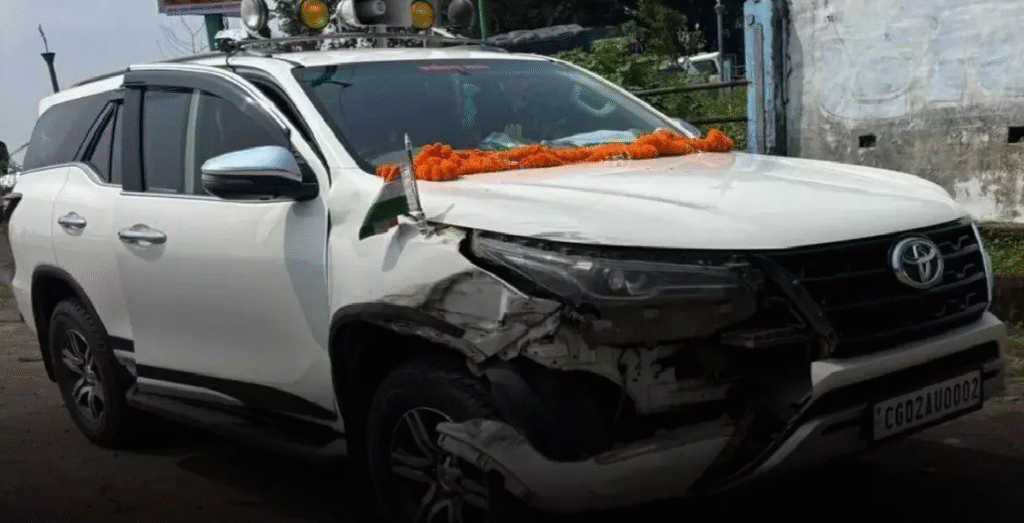health minister accident रायपुर | 1 अक्टूबर 2025| छत्तीसगढ़ के स्वास्थ्य मंत्री श्याम बिहारी जायसवाल मंगलवार सुबह एक सड़क हादसे में बाल-बाल बच गए। जानकारी के अनुसार, मंत्री की कार एक कार्यक्रम में जाते समय एक तेज रफ्तार ट्रक से टकरा गई। टक्कर इतनी तेज थी कि कार का एक हिस्सा क्षतिग्रस्त हो गया, लेकिन गनीमत रही कि मंत्री को कोई गंभीर चोट नहीं आई।