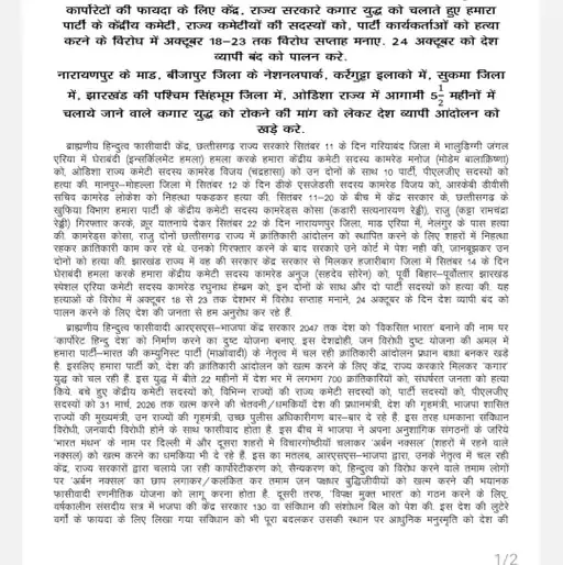 इसी बीच नक्सलियों की केंद्रीय कमेटी ने एक पत्र जारी कर 24 अक्टूबर को देशव्यापी बंद का ऐलान किया है। इस बंद के मद्देनजर बस्तर और अन्य प्रभावित इलाकों में सुरक्षा बलों को अलर्ट पर रखा गया है।