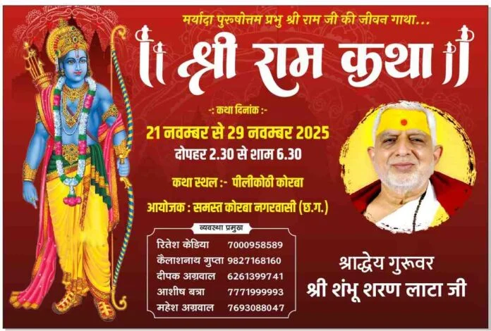 /कोरबा :- मर्यादा पुरुषोत्तम प्रभु श्रीराम जी के जीवन चरित्र पर आधारित श्रीराम कथा का आयोजन कोरबा में बड़े ही श्रद्धा और उत्साह के साथ होने जा रहा है, यह पावन कथा श्री राम भक्तों के ग्रुप के द्वारा प्रभु श्रीराम जी की कृपा से आयोजित की जा रही है। कथा का आयोजन कोरबा नगर के पीलीकोठी में दिनांक 21 नवंबर से 29 नवंबर 2025 तक प्रतिदिन दोपहर 2:30 बजे से शाम 6:30 बजे तक किया जाएगा।