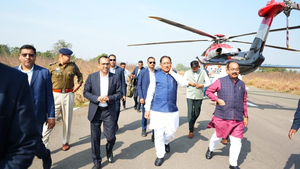 कोरबा 29 नवम्बर 2025/ मुख्यमंत्री श्री विष्णु देव साय, उपमुख्यमंत्री श्री अरुण साव और वित्त मंत्री श्री ओ पी चौधरी आज एक कार्यक्रम में शामिल होने कोरबा पहुँचे। कोरबा के रूमगरा हवाई पट्टी पर हेलीकॉप्टर से उतरने के पश्चात कोरबा कलेक्टर श्री अजीत वसंत, पुलिस अधीक्षक श्री सिद्दार्थ तिवारी,डीएफओ श्रीमती प्रेमलता यादव, निगम आयुक्त श्री आशुतोष पाण्डेय सहित अन्य अधिकारियों ने उनका अभिवादन किया।