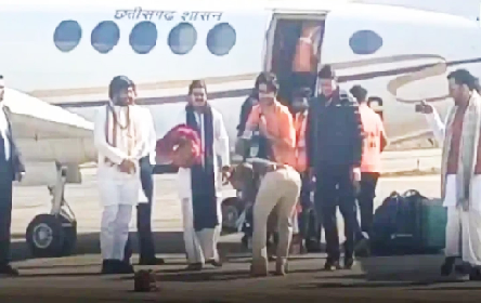 धीरेंद्र शास्त्री का रायपुर आगमन: सरकारी विमान और मंत्री खुशवंत के साथ पैर छूने का विवाद