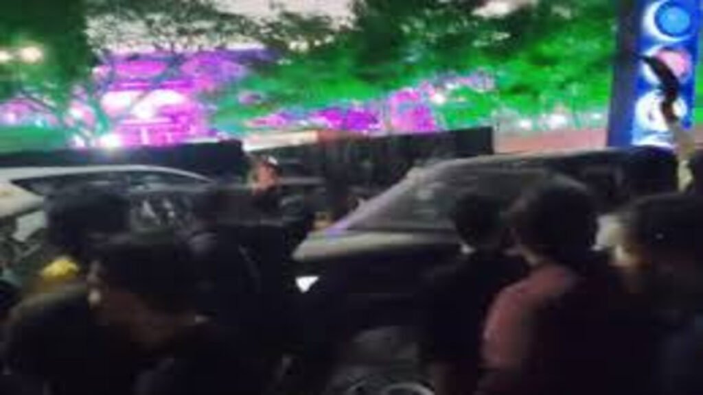 नारेबाजी: जैसे ही सैफ और करीना की सुरक्षा गाड़ियां बाहर आईं, भीड़ ने घेराव करने की कोशिश की।