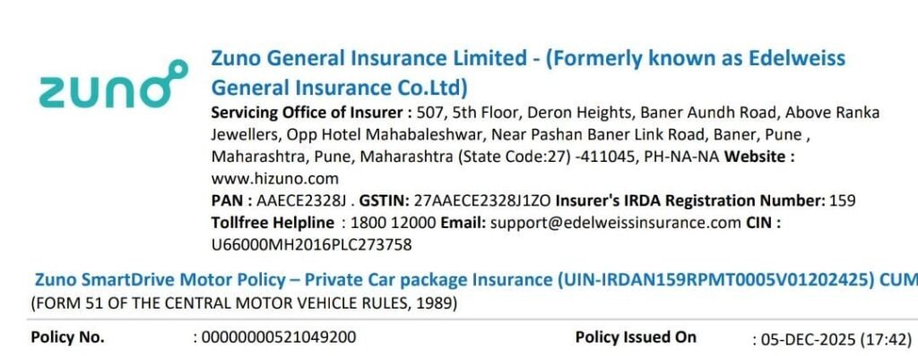 कोरबा। कोरबा निवासी वाहन स्वामी द्वारा अपनी गाड़ी क्रमांक CG 12 BC 8515 (टाटा हैरियर) का बीमा Zuno General Insurance (पूर्व नाम Edelweiss General Insurance) से कराया गया था। यह बीमा स्थानीय डीलर Shivam Motors के माध्यम से कराया गया बताया गया है।