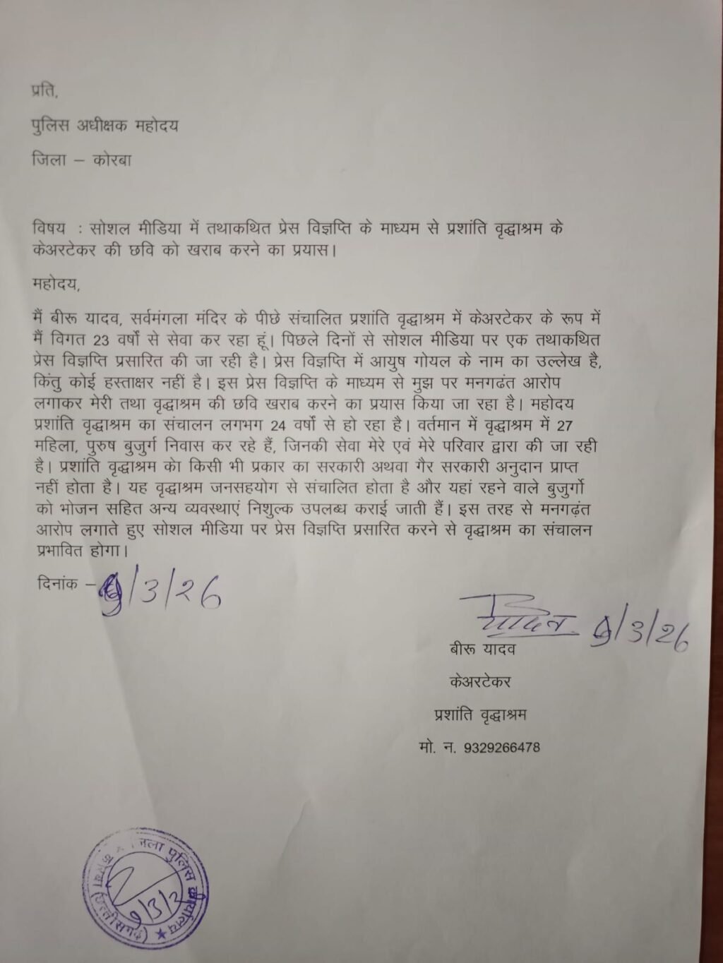 प्रशांति वृद्धाश्रम के केअरटेकर बीरू यादव ने पुलिस अधीक्षक के नाम अपनी शिकायत में बताया है कि विगत दिनों से सोशल मीडिया पर एक तथाकथित प्रेस विज्ञप्ति प्रसारित की जा रही है। प्रेस विज्ञप्ति में जारीकर्ता के नाम के स्थान पर आयुष गोयल नामक व्यक्ति का उल्लेख है। वृद्धाश्रम के केअरटेकर ने शिकायत में लिखा है कि उनके द्वारा 23 वर्षों से परिवार सहित सेवा कार्य किया जा रहा है। तथाकथित प्रेस विज्ञप्ति में मनगढंत आरोप लगाते हुए प्रशांति वृद्धाश्रम तथा केअरटेकर की छवि को खराब करने का प्रयास किया जा रहा है। केअरटेकर बीरू यादव ने अपने शिकायत पत्र में यह भी उल्लेख किया है कि वर्तमान में प्रशांति वृद्धाश्रम में 27 महिला, पुरुष निवासरत हैं। जिन्हें भोजन सहित व्यवस्थाएं निशुल्क उपलब्ध कराई जाती है। वृद्धाश्रम का संचालन पूरी तरह जनसहयोग से किया जाता है। किसी भी प्रकार का शासकीय अथवा गैर शासकीय अनुदान प्राप्त नहीं किया जाता है। इस तरह से मनगढंत और दुर्भावनापूर्ण तरीके से आरोप लगाते हुए सोशल मीडिया पर प्रेस विज्ञप्ति प्रसारित करने से वृद्धाश्रम का संचालन प्रभावित होगा और बेसहारा बुजुर्गों को परेशानी उठानी पड़ेगी। इधर, केअरटेकर बीरू यादव ने आशंका व्यक्त करते हुए कहा कि प्रशांति वृद्धाश्रम की छवि खराब करने के प्रयास के पीछे समाज कल्याण विभाग, कोरबा के लोगों की भूमिका हो सकती है। डेढ़ साल से समाज कल्याण विभाग के लोगों द्वारा प्रशांति वृद्धाश्रम के संचालन में बाधा उत्पन्न करने की कोशिश की जा रही है। यहां तक की वृद्धाश्रम बंद करवा देने की धमकी भी दी जा रही है। इसको लेकर जिला प्रशासन और पुलिस से कई बार लिखित शिकायत की जा चुकी है, लेकिन संबंधित विभाग के लोगों के खिलाफ कोई कार्रवाई नहीं की गई है।