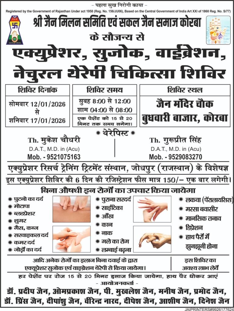 कोरबा। श्री जैन मिलन समिति एवं सकल जैन समाज कोरबा के सौजन्य से शहर में एक्यूप्रेशर, सुजोक, वाइब्रेशन एवं नेचुरल...