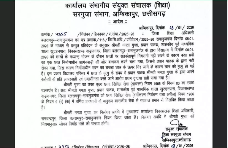 बलरामपुर छत्तीसगढ़ के बलरामपुर जिले से एक गंभीर मामला सामने आया है, जहां 9 महीने की गर्भवती शिक्षिका ने स्कूल...