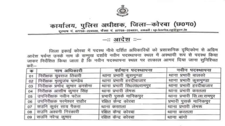 कोरबा। नव वर्ष के पहले दिन जिला पुलिस अधीक्षक सिद्धार्थ तिवारी ने प्रशासनिक दृष्टिकोण से बड़ा कदम उठाते हुए जिले...