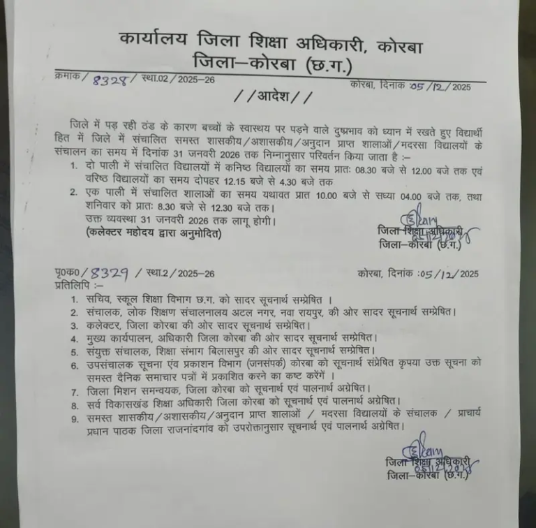 कोरबा। जिले में बढ़ती ठंड और बच्चों के स्वास्थ्य पर पड़ते प्रभाव को देखते हुए जिला शिक्षा अधिकारी ने सभी...