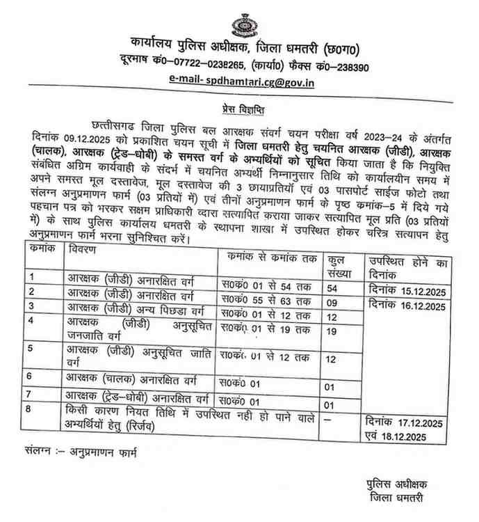 Aarakshak Chayan , रायपुर। छत्तीसगढ़ जिला पुलिस बल आरक्षक संवर्ग चयन परीक्षा वर्ष 2023-24 के अंतर्गत चयनित अभ्यर्थियों के लिए...