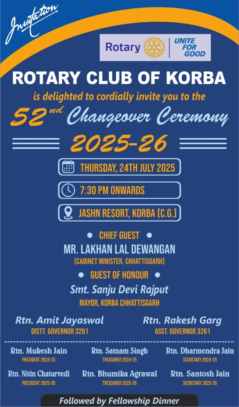 कोरबा, 23 जुलाई 2025 // रोटरी क्लब ऑफ कोरबा द्वारा 52वां चेंजओवर समारोह बड़े ही हर्षोल्लास और गरिमामयी वातावरण में...